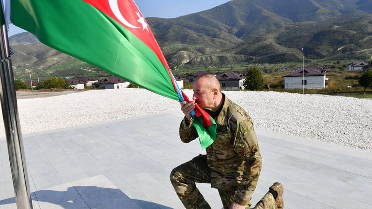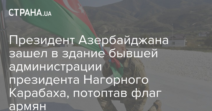 Президент Азербайджана Ильхам Алиев под торжественную музыку зашел в здание бывшей администрации президента Нагорного Карабаха. При этом он прошелся по флагу армян Карабаха.