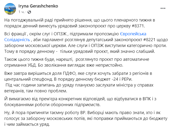 "Все фракции, кроме слуг и ОПЗЖ, поддержали предложение Европейская Солидарность, чтобы парламент рассмотрел депутатский законопроект №8221 о запрете московской церкви. Но слуги и ОПЗЖ выступили категорически против. Поэтому в повестке дня только правительственный проект, который значительно слабее", - написала Геращенко.