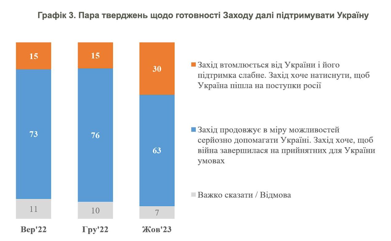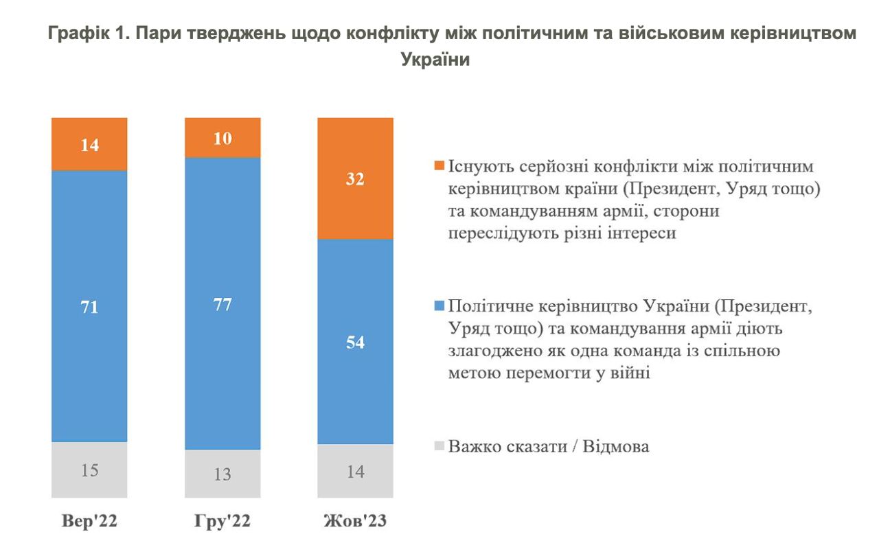 В Украине за последний год выросло количество людей, которые считают, что Запад устал от Украины, что власть готова на неприемлемые компромиссы с РФ и что есть конфликт между военным и политическим руководством страны.