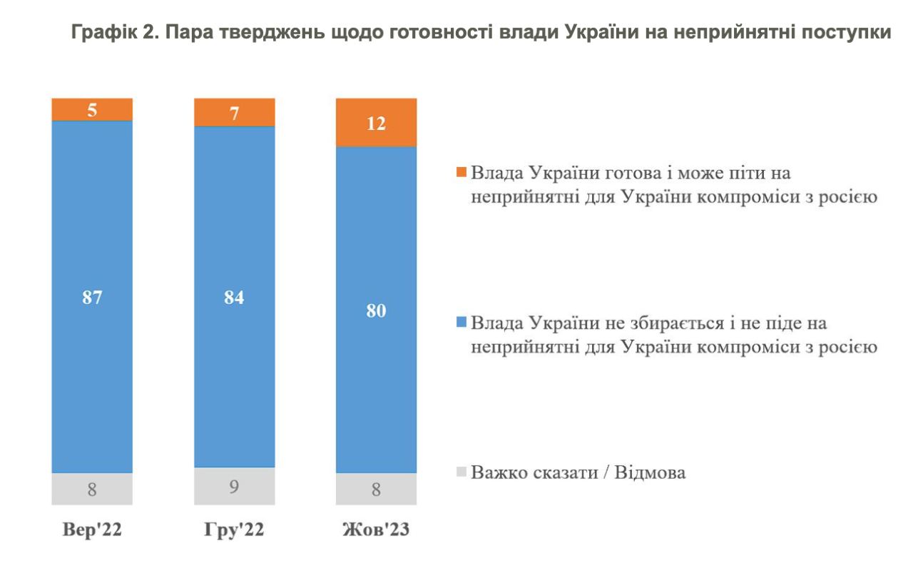 В готовность власти к "неприемлемым компромиссам" с РФ год назад верили 5%, в этом году - уже 12%. 80% - не верят.