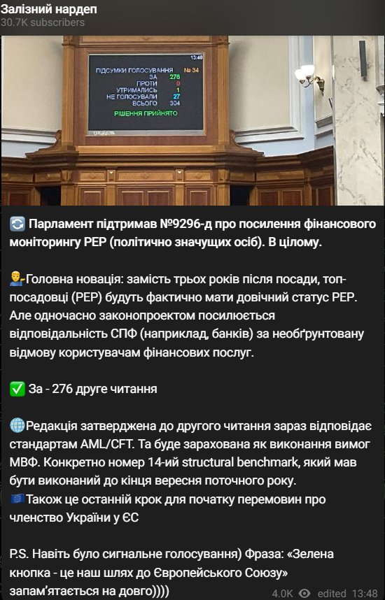 Верховная Рада поддержала в целом законопроект об усилении финансового мониторинга политически значимых лиц (PEP).
