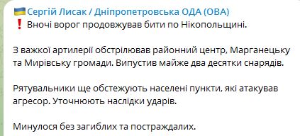 08.00 Ночью РФ из тяжелой артиллерии ударила по Никопольщине.