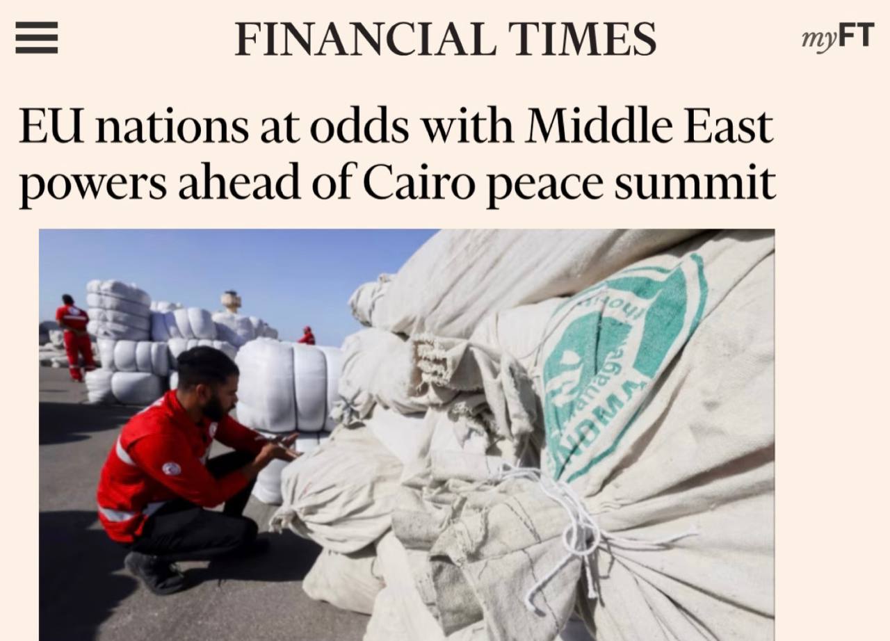 "На мирном саммите в Каире в минувшие выходные страна за страной обрушивались на представителей ЕС (лидеров Италии, Испании, Греции и Кипра, а также председателя Совета Евросоюза, его главного дипломата и министров иностранных дел Франции и Германии). Их резко обвиняли в двойных стандартах и лицемерии, поскольку они осуждали нарушения гуманитарного права Россией, но не Израилем.
