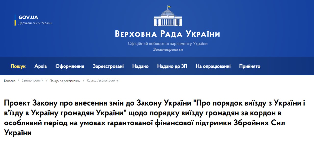 В проекте предлагается внести изменения в правила пересечения границы во время военного положения, добавив в перечень разрешительных документов еще один пункт, согласно которому при выезде за границу мужчины должны открыть счет в государственном банке с минимальным взносом 12 945 грн и пополнять его каждый месяц во время пребывания за границей на 1 306,5 грн, с предоставлением банку разрешения перечислять эти взносы на спецсчет ВСУ.