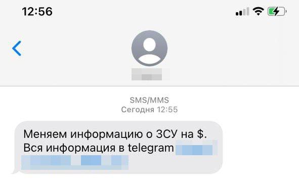 "Меняем информацию о ВСУ на $", - сказано в СМС, отправленном от пользователя Krayina.