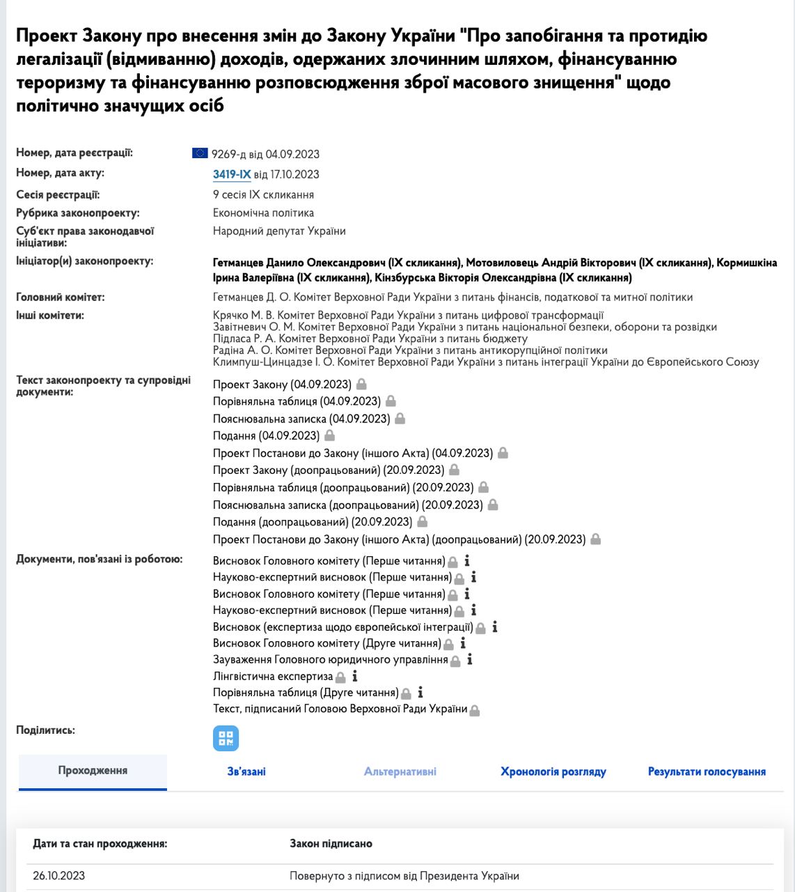 В карточке указано, что 26 октября закон был возвращен в парламент с подписью от президента Украины. Это последний этап для вступления закона в силу.