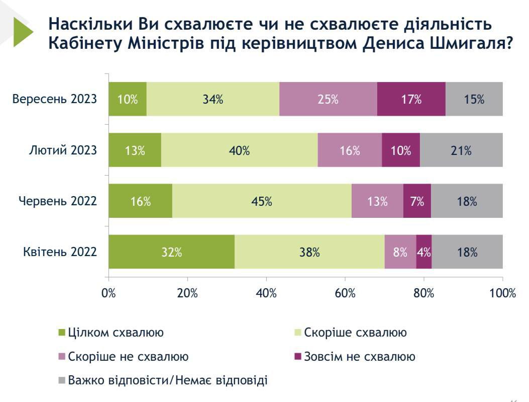 Данные по поводу поддержки премьер-министра изменились еще значительнее: в феврале деятельность Дениса Шмыгаля одобряли 53%, в сентябре - 44%; не одобряли в феврале 26%, в сентябре - 42%.