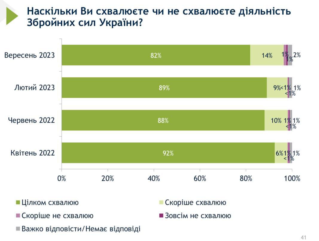 Данные о поддержке ВСУ изменились меньше: семь месяцев назад их деятельность одобряли 89%, не одобряли 9%, в сентябре - соответственно 82 и 14%.