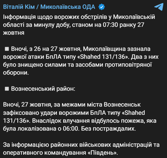 "Ночью, 27 октября, в окрестностях города Вознесенск зафиксированы удары враждебными БПЛА типа Shahed 131/136. В результате попадания произошел пожар, который был локализован в 06:00. Без пострадавших", - написал Ким.