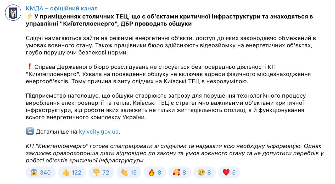 "Дело ГБР не касается непосредственно деятельности КП "Киевтеплоэнерго". Постановление о проведении обыска не содержит адреса физического местонахождение энергообъектов. Поэтому причина визита следователей на Киевские ТЭЦ непонятна", - заявляет КГГА.