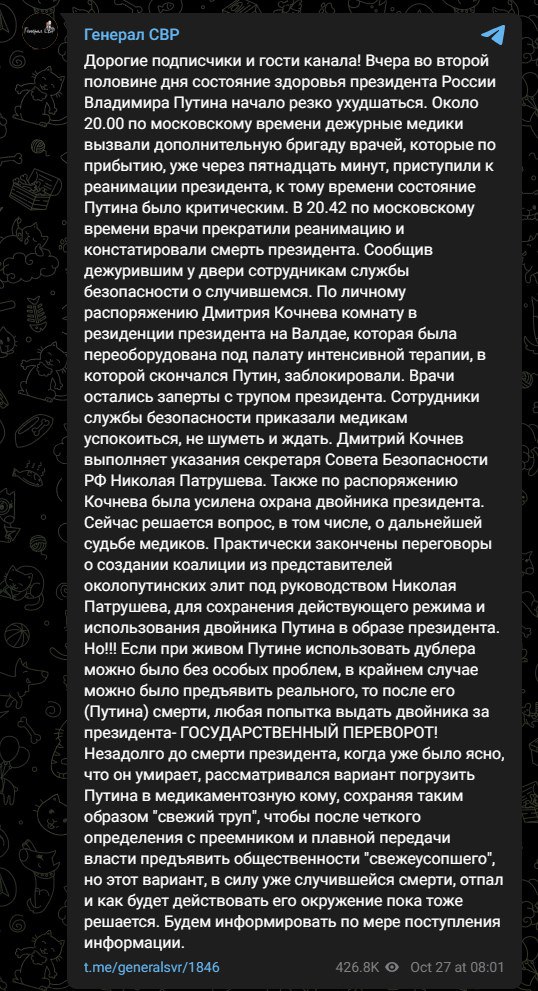 Подтверждений эта информация не имеет. Но в украинских медиа и в российских оппозиционных телеграм-каналах этот слух широко разошелся.