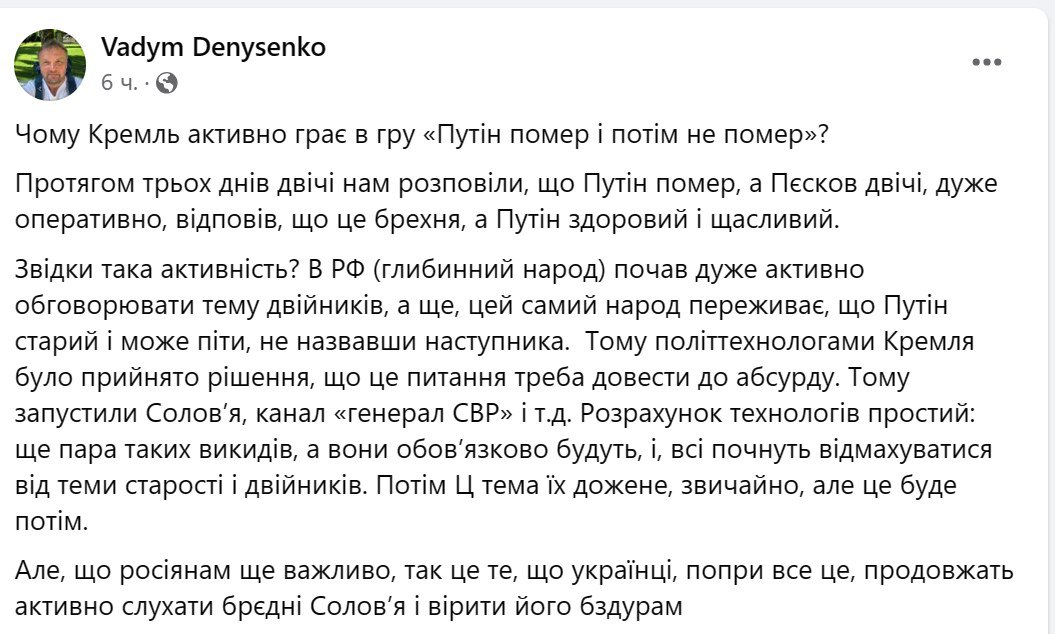 Директор Украинского института будущего Вадим Денисенко полагает, что при помощи столь абсурдных фейков российские власти пытаются высмеять тему "двойников Путина", которую муссируют, в том числе в Украине.