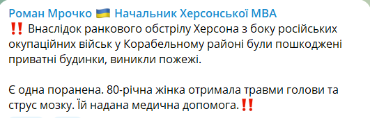Утром 28 октября российские военные обстреляли центр Херсона. Повреждены частные дома, получила ранения 80-летняя женщина.