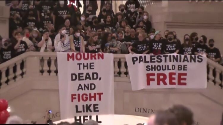 Ранее организация "Еврейский голос за мир", которая выступает против действий Израиля в секторе Газа, проводила акцию протеста в одном из зданий Конгресса США в Вашингтоне. Активисты призывали прекратить боевые действия и остановить военную помощь США Израилю.