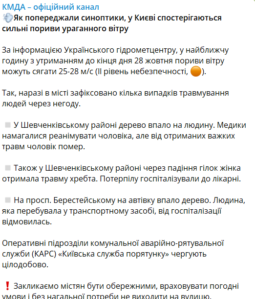 - в Шевченковском районе дерево упало на человека, медики пытались реанимировать мужчину, но от полученных травм он скончался;