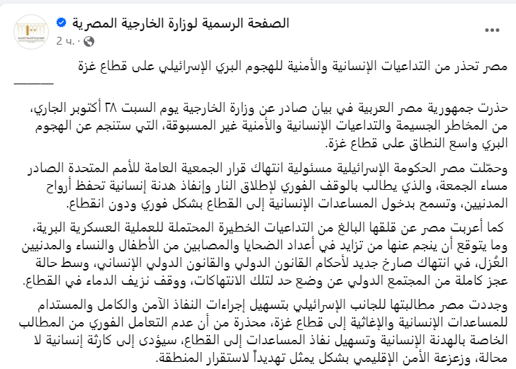 Министерство иностранных дел Египта предупредило о "серьезных опасностях и беспрецедентных гуманитарных последствиях для безопасности", которые могут быть вызваны сухопутной операцией в Газе.