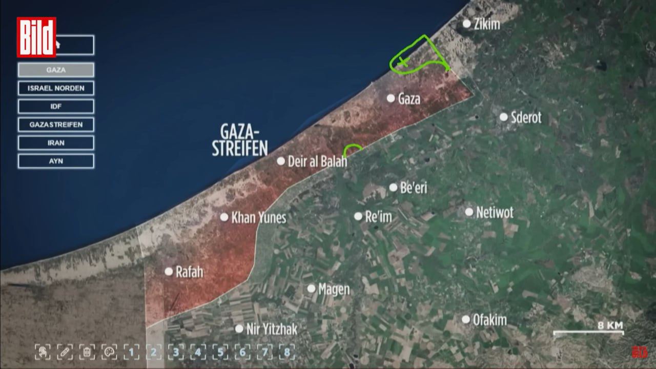 Израиль, вероятно, взял под контроль до 7 кв. км на севере сектора Газа. Об этом сообщает военный эксперт BILD Юлиан Рёпке, анализируя кадры с места событий.