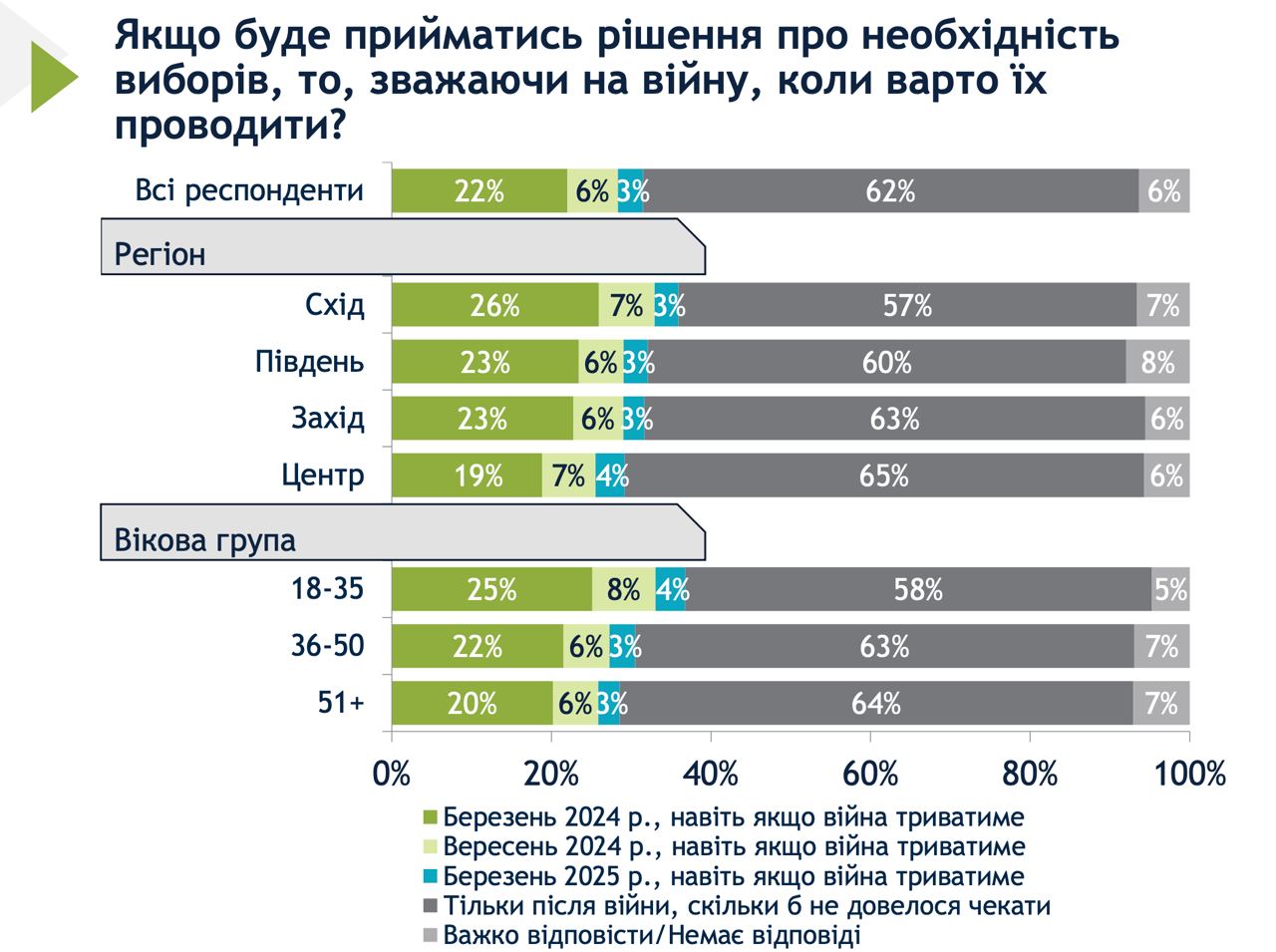 62% опрошенных сказали, что любые выборы нужно проводить после окончания войны - не важно, сколько этого придется ждать.