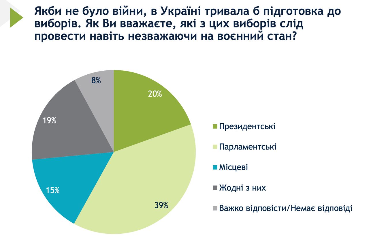 Из тех, кто высказался за проведение выборов во время боевых действий, 39% считают, что нужно провести президентские выборы, 20% - парламентские, 15% - местные.