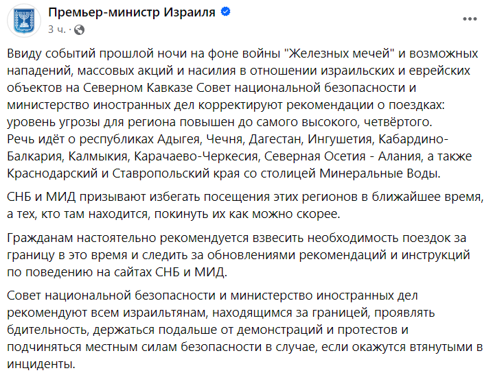 "Существуют опасения о возможных нападениях, а также массовых и жестоких протестах в отношении израильтян и евреев на Северном Кавказе в республиках: Адыгея, Чечня, Дагестан, Ингушетия, Кабардино-Балкария, Калмыкия, Карачаево-Черкесия, Северная Осетия-Алания, а также Краснодарском и Ставропольском краях. Гражданам Израиля и евреям строго рекомендуется не посещать указанные места, а тем, кто находится там сейчас - немедленно покинуть эти территории", - также говорится в сообщении канцелярии премьер-министра Израиля Биньямина Нетаньяху.