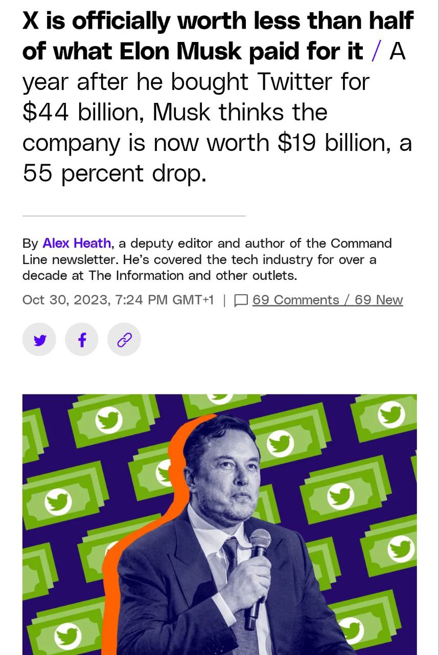 Если Маск выкупил Твиттер за 44 миллиарда долларов, то сейчас стоимость Х оценивается в 19 млрд (или 45 долларов за акцию).