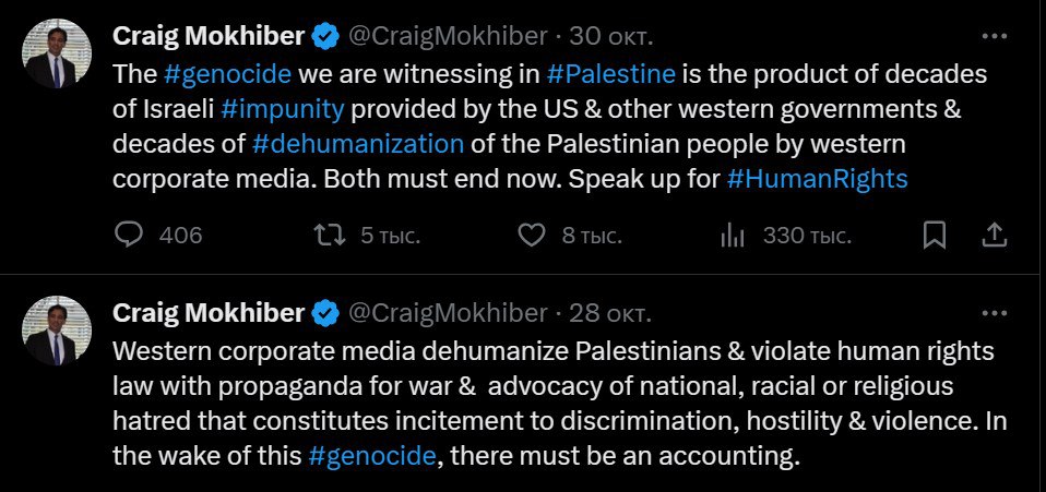 Крейг Мохайбер, директор нью-йоркского отделения Верховного комиссара ООН по правам человека, заявил, что сектор Газа является хрестоматийным примером геноцида.