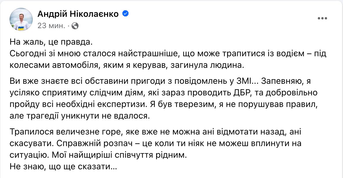 "К сожалению, это правда. Сегодня со мной произошло самое страшное, что может случиться с водителем: под колесами автомобиля, которым я управлял, погиб человек. Уверяю, я всячески буду способствовать следственным действиям и добровольно пройду все необходимые экспертизы. Я был трезв, я не нарушал правил, но трагедии избежать не удалось", - написал нардеп в соцсети Фейсбук.