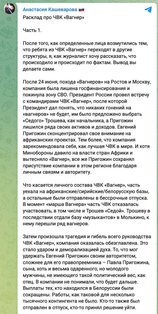 Об этом пишет в своем телеграм-канале российская журналистка Анастасия Кашеварова в посте, посвященном тому, что сейчас происходит в бывшей ЧВК.