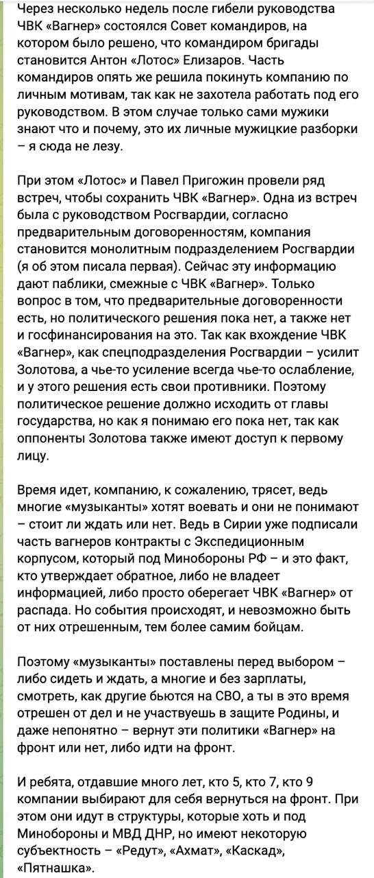 Журналистка связывает это с тем, что многие в окружении Путина не хотят усиления позиций главы Росгвардии Виктора Золотова. Поэтому пока "вагнеровцы" находятся в подвешенном состоянии. Некоторые из них уже уехали в Сирию по контракту с Минобороны РФ. Другие отдельно или мелкими группами вливаются в другие формирования в структуре МО РФ или Росгвардии: "Редут", "Ахмат", "Каскад" или "Пятнашка".
