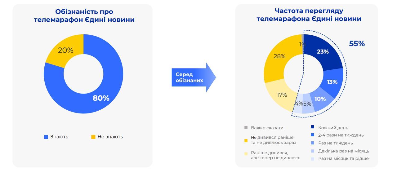 55% опрошенных украинцев заявили, что хотя бы иногда смотрят телемарафон. Год назад таких было 96% (второй скрин).