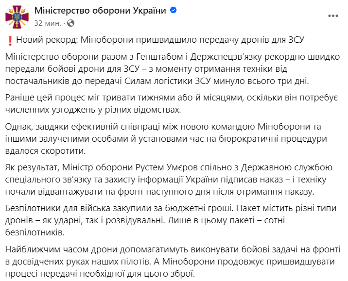 "С момента получения техники от поставщиков до передачи Силам логистики ВСУ прошло всего три дня. Ранее этот процесс мог длиться неделями или месяцами, поскольку он нуждается в многочисленных согласованиях в различных ведомствах", - заявили в МО, комментируя передачу войскам новой партии из сотен беспилотников.