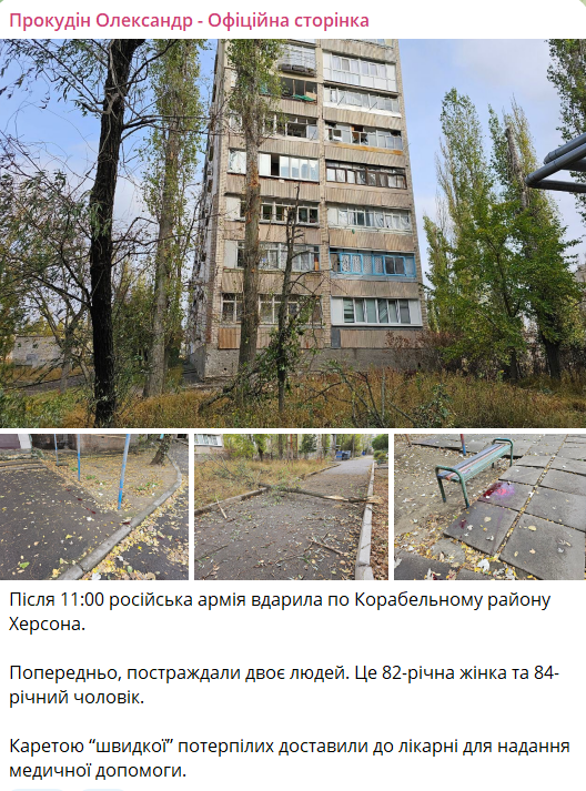 "После 11:00 русская армия ударила по Корабельному району Херсона. Предварительно пострадали два человека. Это 82-летняя женщина и 84-летний мужчина", - написал он.