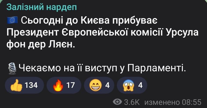 "Сегодня в Киев прибыла президент Европейской комиссии Урсула фон дер Ляйен", – написал Железняк в Telegram.