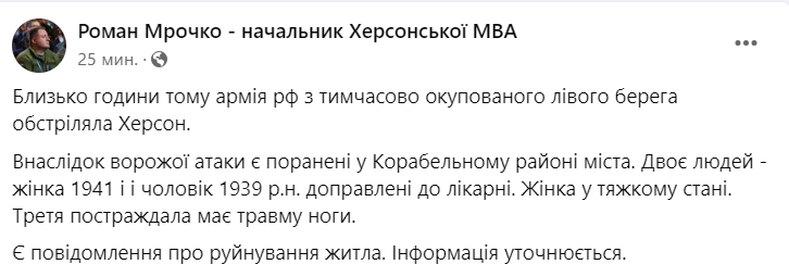 "В результате вражеской атаки есть раненые в Корабельном районе города. Два человека - женщина 1941 и мужчина 1939 г.р. доставлены в больницу. Женщина в тяжелом состоянии. Третья пострадавшая имеет травму ноги", - написал Мрочко.