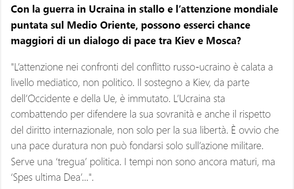 Министр обороны Италии Гвидо Крозетто считает, что время для мирных переговоров между Украиной и РФ ещё не пришло, но "политическое перемирие" необходимо.