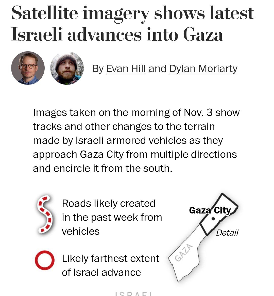 Войска, двигавшиеся с востока южнее Газы, также преодолели аналогичное расстояние и отрезали город с юга. Вывод о продвижении сделан на основе заметных со спутника следов от бронетехники, по которым можно оценить глубину наступления ЦАХАЛ (на карте).