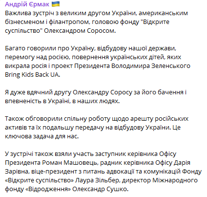 "Много говорили об Украине, восстановлении нашего государства, победе над Россией, возвращении украинских детей, которых похитила Россия, и проекте президента Владимира Зеленского Bring Kids Back UA. Я очень благодарен другу Александру Соросу за его видение и уверенность в Украине, в наших людях. Также обсудили совместную работу по аресту российских активов и их дальнейшую передачу на восстановление Украины", - перечислил главные темы переговоров глава ОП.