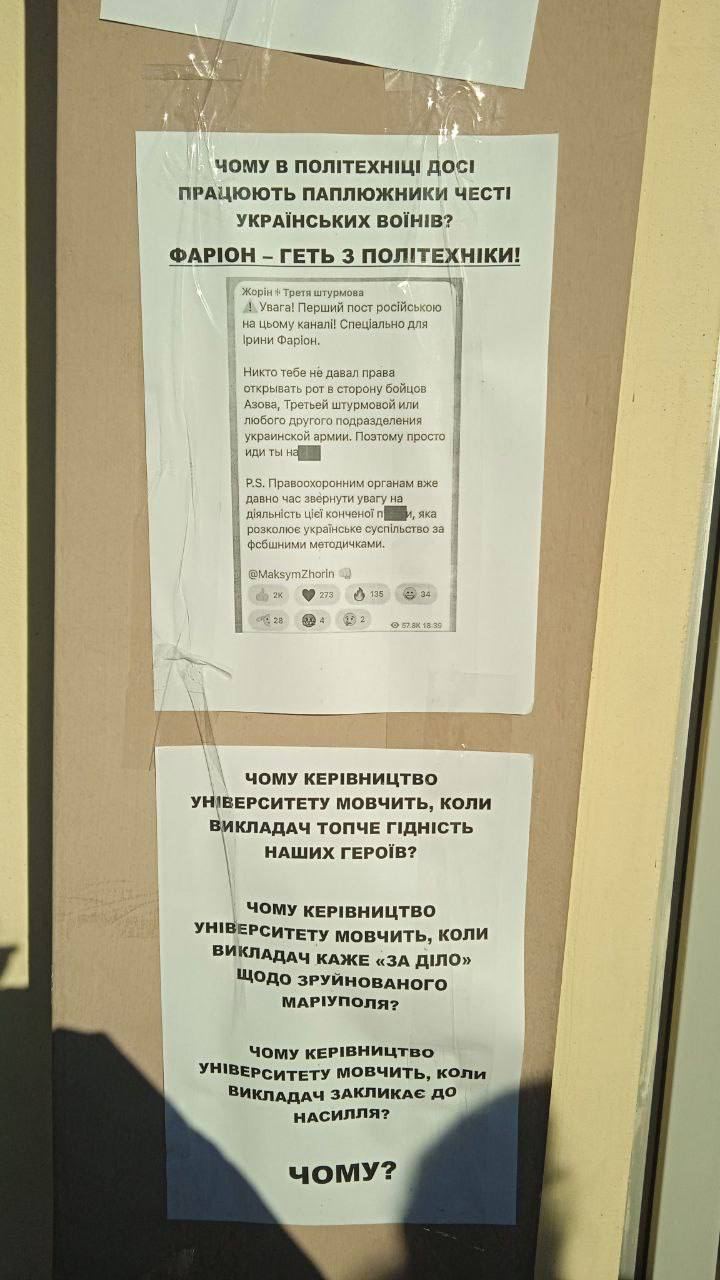 "Почему в "Политехнике" до сих пор работают те, кто порочит украинских воинов? Фарион, прочь из "Политехники"! Почему руководство университета молчит, когда преподаватель топчет достоинство наших героев? Почему руководство университета молчит, когда преподаватель говорит "За дело" относительно разрушенного Мариуполя? Почему руководство университета молчит, когда преподаватель призывает к насилию? Почему?" - говорится в листовке.