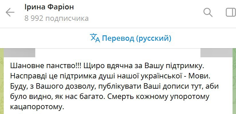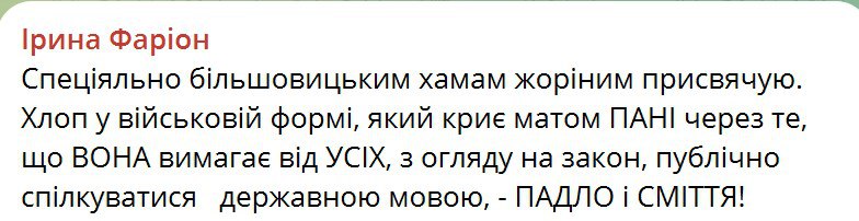 "Смерть каждому упоротому кацапоротому", - заключила Фарион.