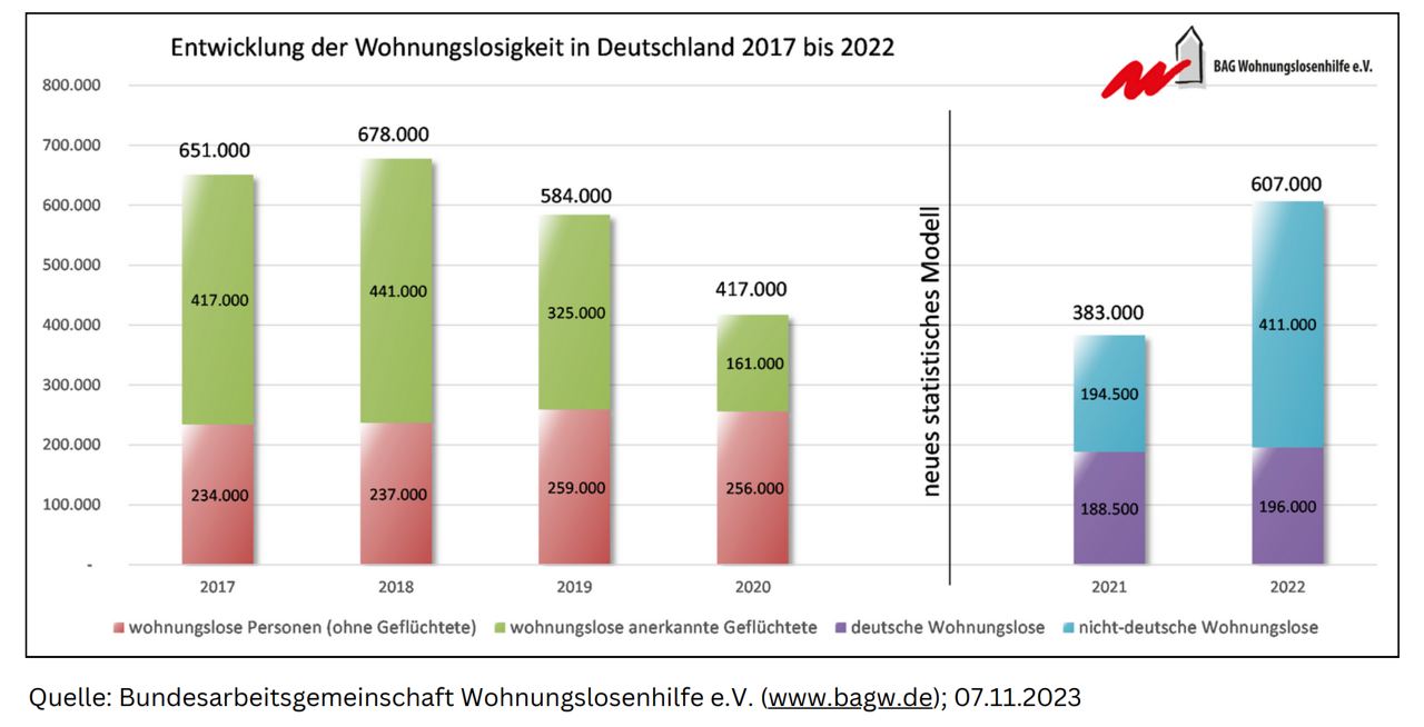 Далеко не все эти люди живут на улице. По состоянию на 31 января 2023 года власти насчитали 372 тыс. бездомных, проживающих в жилье. Подавляющее большинство размещенных бездомных — это беженцы из Украины, Сирии, Афганистана и Ирака.