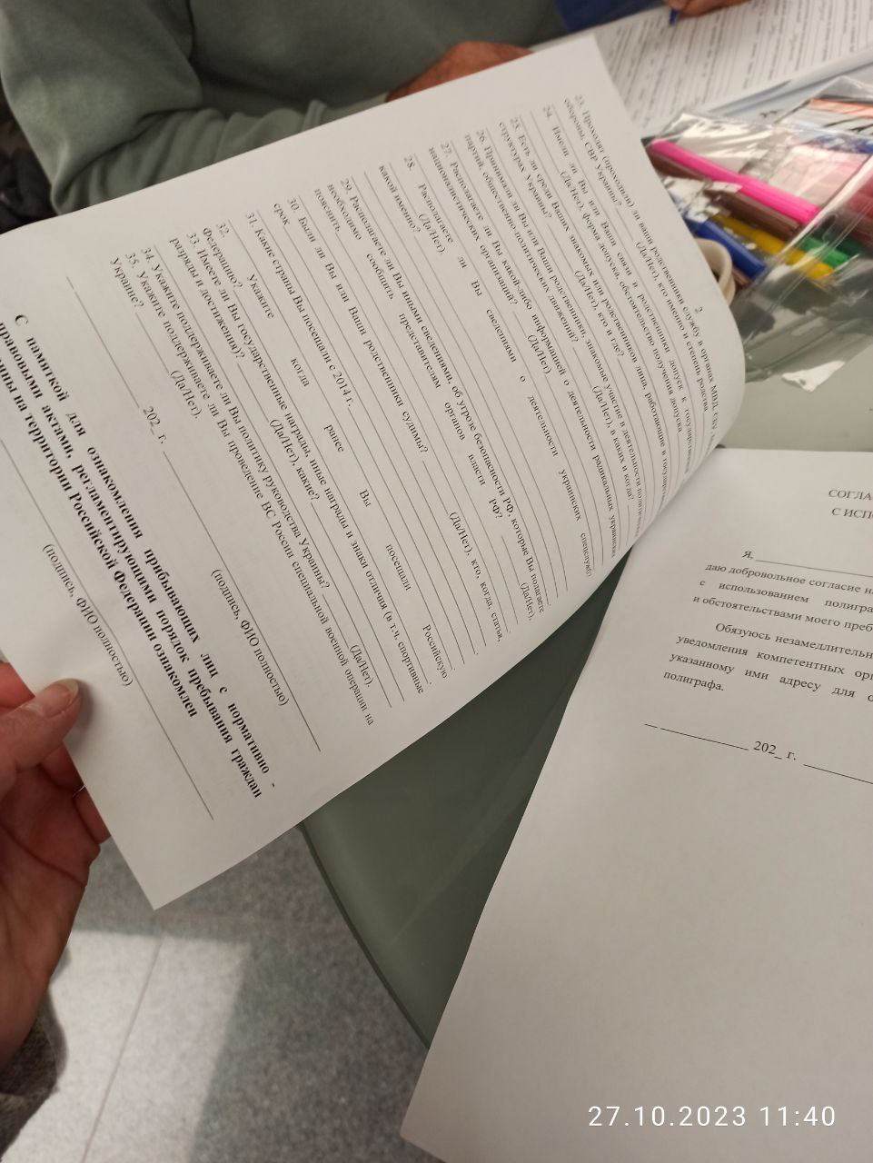 Еще одна бумага, обязательная к заполнению — согласие на прохождение детектора лжи. "Полиграф около четырех часов по длительности. Но это дополнительная проверка, направляют не всех подряд и предварительно докладывают вышестоящему начальнику", — рассказывает украинка Людмила.
