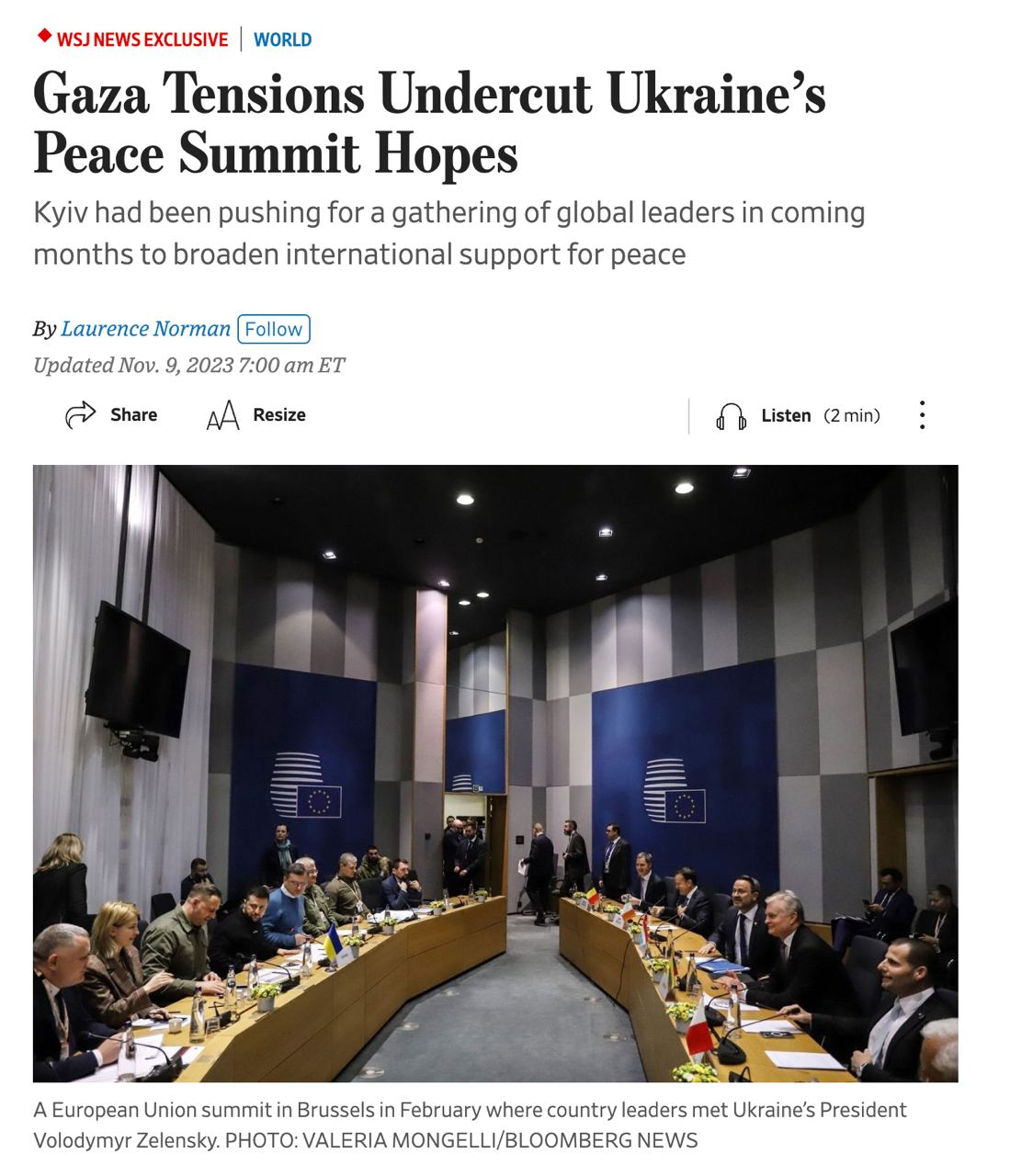 15.20 Война Израиля с ХАМАС "подрывает надежды Украины на мирный саммит", пишет The Wall Street Journal.