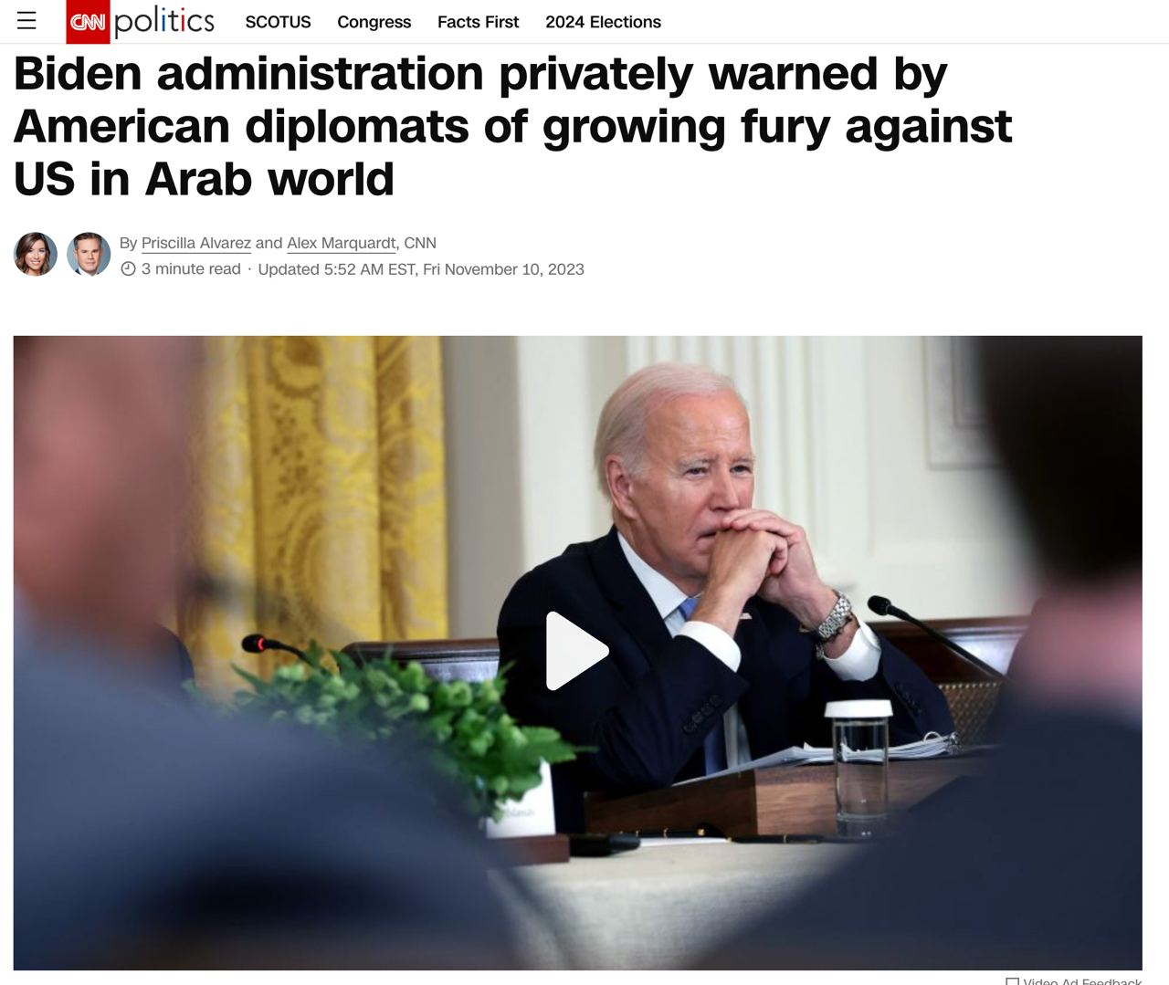 Сообщается, что внутри администрации растет обеспокоенность по поводу поддержки США Израиля, а также Байден столкнулся с "растущим разочарованием внутри страны".