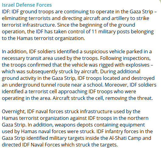 14:30 Армия обороны Израиля с начала наземной операции взяла под контроль 11 военных постов, принадлежащих  ХАМАС.