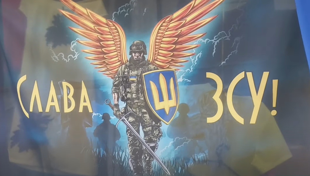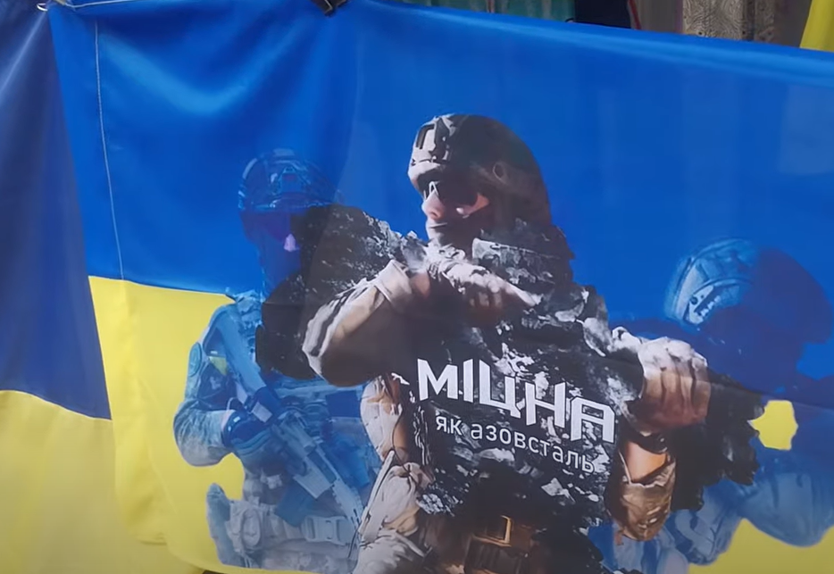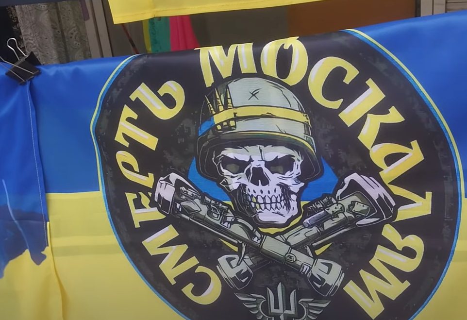 На рынке среди продуктов представлен огромный выбор украинских флагов — как ВСУ, там и добровольческих батальонов. Цена — 275 гривен.