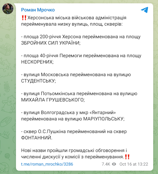 • площадь 200-летия Херсона стала площадью Вооруженных сил Украины;