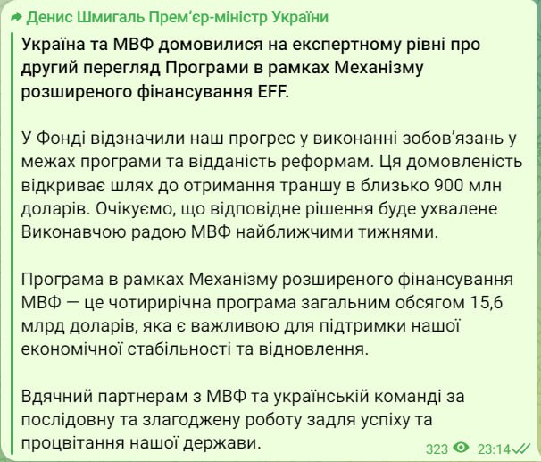 "Эта договоренность открывает путь к получению транша около 900 млн долларов. Ожидаем, что соответствующее решение будет принято исполнительным советом Международного валютного фонда в ближайшие недели", – написал премьер.