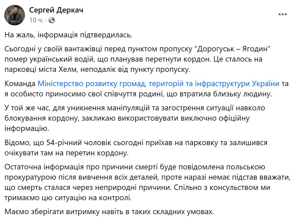"Окончательная информация о причинах смерти будет сообщена польской прокуратурой после изучения всех деталей, однако пока нет оснований полагать, что смерть произошла по неестественным причинам", – отметил Деркач.