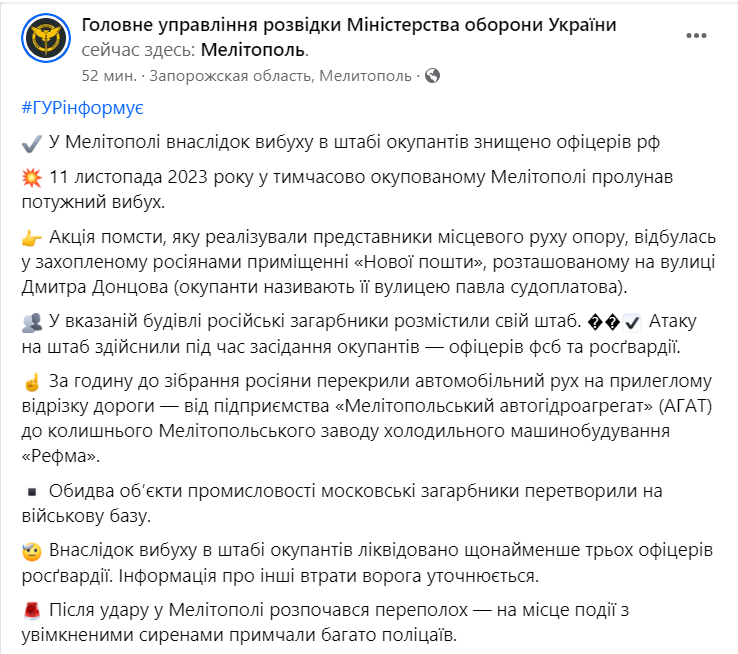 "В результате взрыва в штабе оккупантов ликвидированы по меньшей мере три офицера росгвардии. Информация о других потерях врага уточняется", - отмечают в разведке.