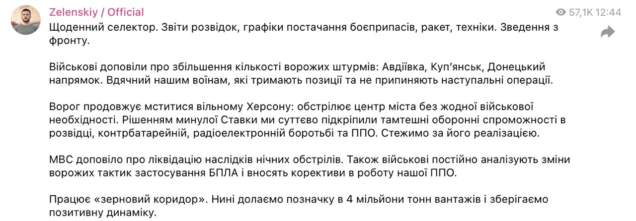 Как сообщает Зеленский, об этом военное командование доложило ему на сегодняшнем селекторе.